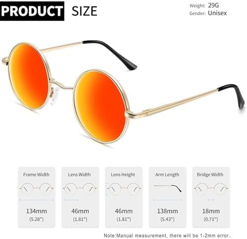 • ✔ DIMENSIONS - Lens Width:46mm | Lens Height:46mm | Temple Length:138mm | Nose Bridge:18mm. All measurements are hand-measured, there may be 1-2 mm error