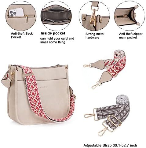 • ✔【2-PCS Adjustable Removable Straps】Each CAITINA women's hobo handbag is equipped with 2 adjustable removable crossbody wide shoulder straps :1 weaving shoulder strap + 1 boho style strap,crossbody bag internal use fabric lining and high quality gold hardware,Also the strap is equipped with a gold metal clip attachment for easy clipping to any ladies cross body bag,that can be easily changed out quickly to give your bag a different look.